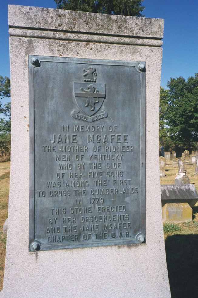This photo was taken by Pete McAfee and is posted here with his permission. The monument is located at New Providence Presbyterian Cemetery, in the are that the early people are buried. It was erected by the Jane McAfee Chapter of the D.A.R. in Harrodsburg. Jane McAfee died in 1783, and is buried next to her son-in-law, Thomas Guant, in the Guant farm. Her exact gravesite is no longer known.